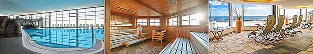 Wellness: Innen-Pool, Sauna, Massagen, Kosmetik, Fitness.