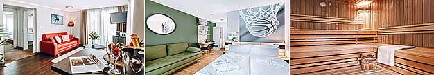 Wellness: Innen-Pool, Sauna, Massagen, Kosmetik, Fitnessraum.