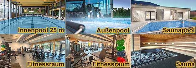 Wellnessbereichs Waldblick mit Schwimmbad, 2 Außenpoolanlagen, 3 Saunen, Dampfbad, Behandlungsräumen und Fitnessarea